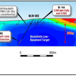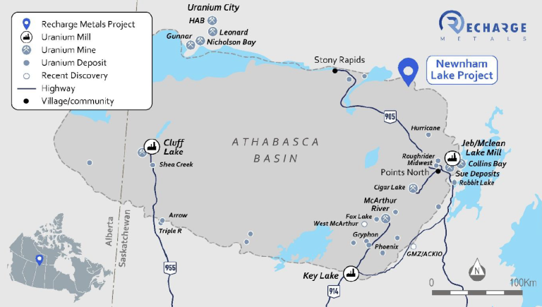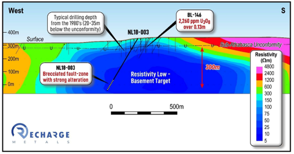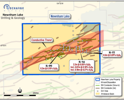 Recharge believes that the potential for uranium mineralisation within the Newnham Lake Property exists along the conductive structures deeper in the basement rocks. Geophysical surveys (tested by ALX) have demonstrated an exceptionally large scale, hydrothermal system extending to depth, beneath the conductive lithologies at Newnham Lake.