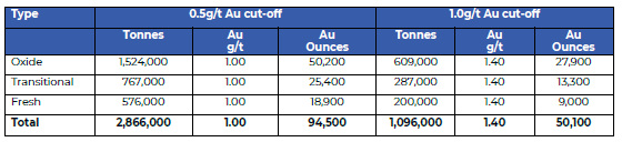 The Company reports that the Prospero Gold Mineral Resource Estimate (MRE) has been reviewed and is now reported in accordance with the JORC Code (2012 Edition). The Prospero MRE comprises an Inferred Mineral Resource of 2.87Mt at 1.0g/t Au for 94.5koz, using a 0.5g/t Au cut-off grade. limited drilling into fresh rock.