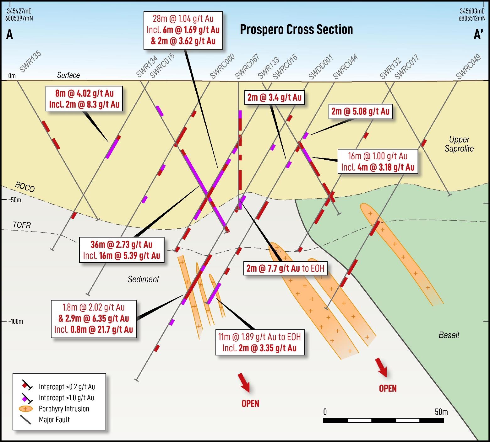 Significant historical intercepts along the Prospero trend, outside of the current Mineral Resource, include: