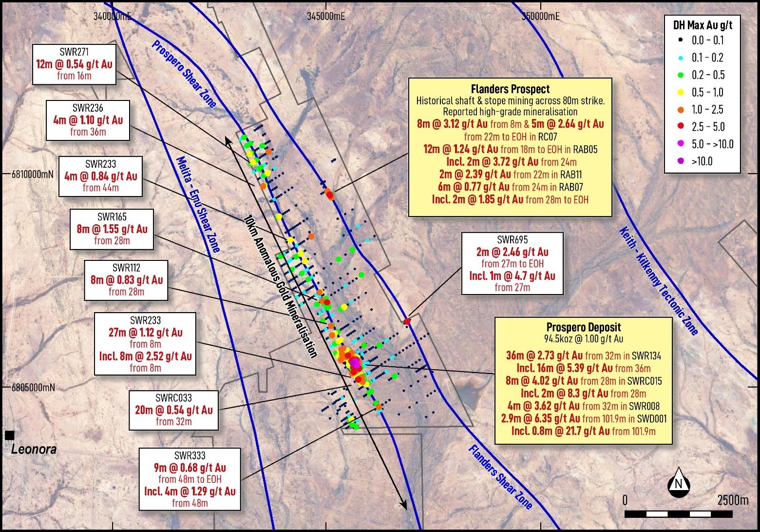 Drillhole SWRB105, completed by Gilt-Edged Mining in 1998 and located approximately 3.5km southeast of the Flanders Prospect, returned 2m @ 2.46g/t Au from 27m to end of hole, including 1m @ 4.7g/t Au from 27m (refer Figure 2).