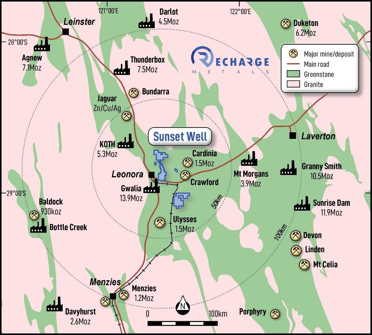 The Sunset Well Project is located approximately 10km east of Leonora and within 100km of seven operating gold processing plants. The tenement package comprises ten (10) granted Prospecting Licenses, fifteen (15) Prospecting License Applications, and four (4) Exploration License Applications, covering a total of 181km². Access is straightforward via the Goldfields Highway and Leonora-Laverton Road.